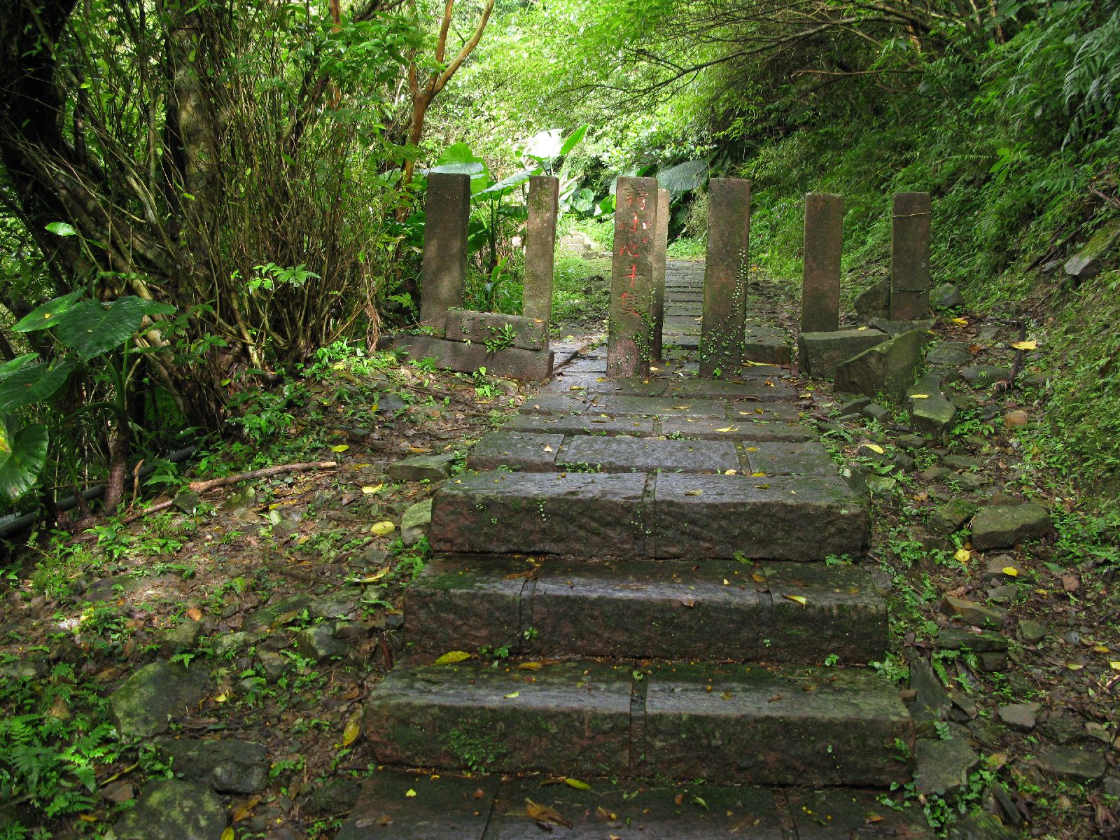 強い風が吹き抜ける稜線近くは背の低い潅木しかないが、麓は高い樹木が生い茂っている。木漏れ日が差し、風もなく汗が噴出す。登り一本の道は、ところどころ開けた広場やベンチが設けてある。ただ、どこも同じだが座る人はほとんどいないようで、苔むしている。登ること30分ぐらい、振りかえると大渓港や沖には亀山島が見える。さらに登るとあずま屋が高台に設けられている。周囲は樹木が高くしげっているので、海が見えるほか、あまり景観はない。ここからは、山道は草嶺稜線から派生する枝尾根を行く。少しの登り下りを過ぎると、右から旧来の細い土の山道が合流する。さらに登ると、今度は右に蕃薯寮山を右に巻いていく、小道が分岐する。ここまで登りはじめて1時間である。
