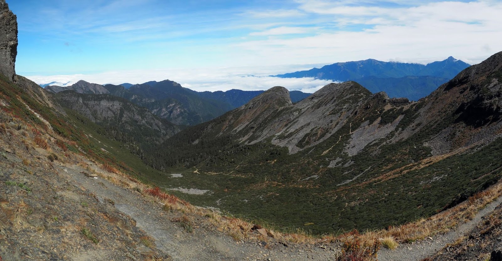 | 頭鷹山の下りで北方向を見る、前方は大南山、左に火石山、そしてその背後には聖稜線。右は大劍山 |