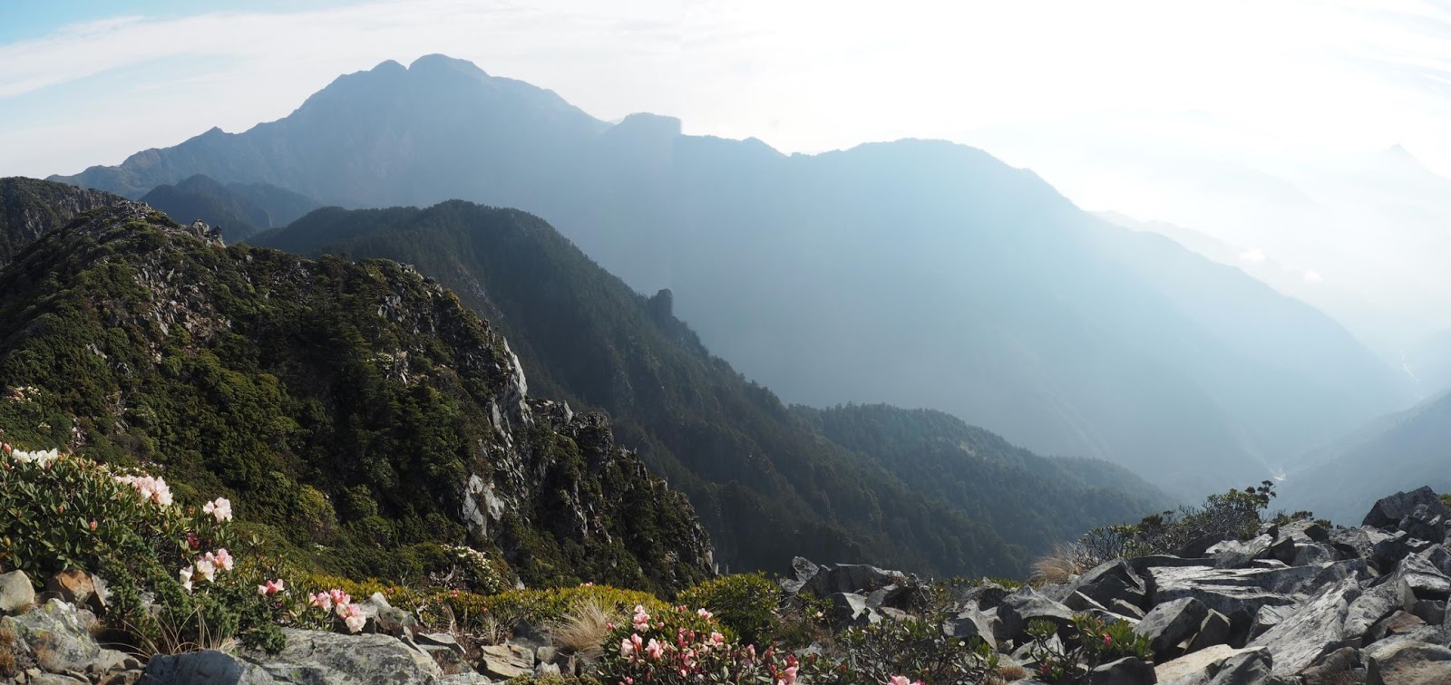 | シャクナゲの咲く佳陽山から望む大劍山、手前は布伕奇寒山 |