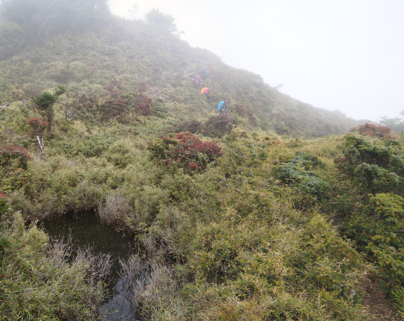 台湾の南部は、冬は好天の日が多い。高雄市と台東縣との境界で分水嶺になる南一段は、西側の好天と雲が谷間を埋める東側の天候をちょうど分ける。東北季節風のために東側の勢力が強ければ、ぐずついた天気になり、一方季節風の勢力が弱ければ天候に恵まれる。今年は、例年に比べ雨が多いようだ。南一段は、水場が少なく苦労する縦走ルートでもあるが、そのため天池と呼ばれる水溜まりには水がけっこうあり、水の苦労は少なかった。実際に雨に降られたのは、行動前の夜であった。しかし、背の丈を越えるヤタケは雨で湿り、藪漕ぎをすると全身ずぶぬれになる。天気が良くても、陽光が届かない日陰のヤタケも同じく湿っていて濡れる。今回は初日と最終日を除いて、雨具をつけたままの縦走であった。ヤタケの藪漕ぎは、ほかのルートでもあるが、今回は特に濡れていて一層の苦労を強いられた。