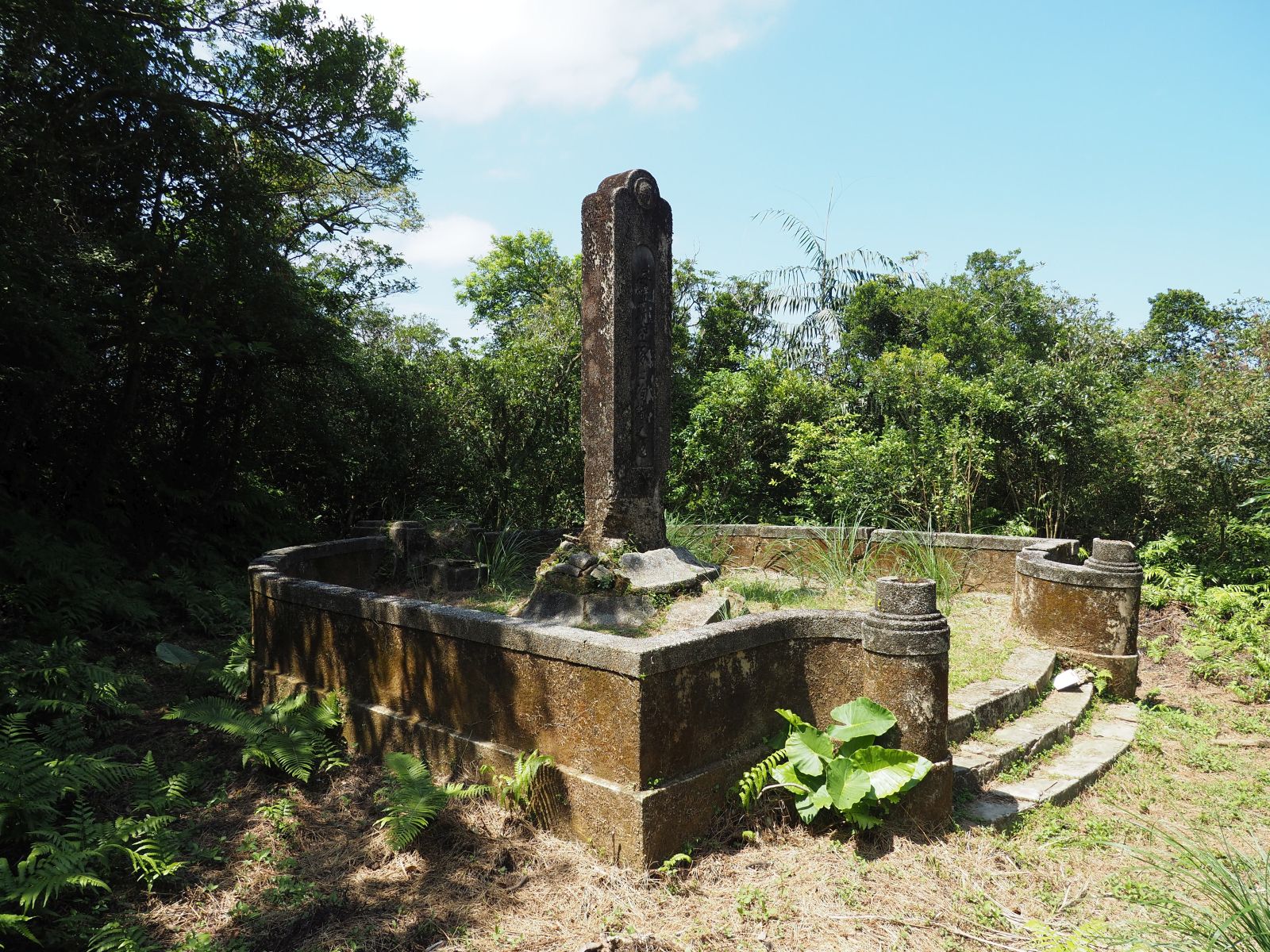 桃源谷步道にでて灣坑頭山に続く。左から二番目の道を進む。道は下っていく。遠くに海が見える。15時14分、分岐を左にとり、登りが始まる。15時20分、墓地の脇に大嶺古道入り口の大きな石碑が現れる。休憩をとる。