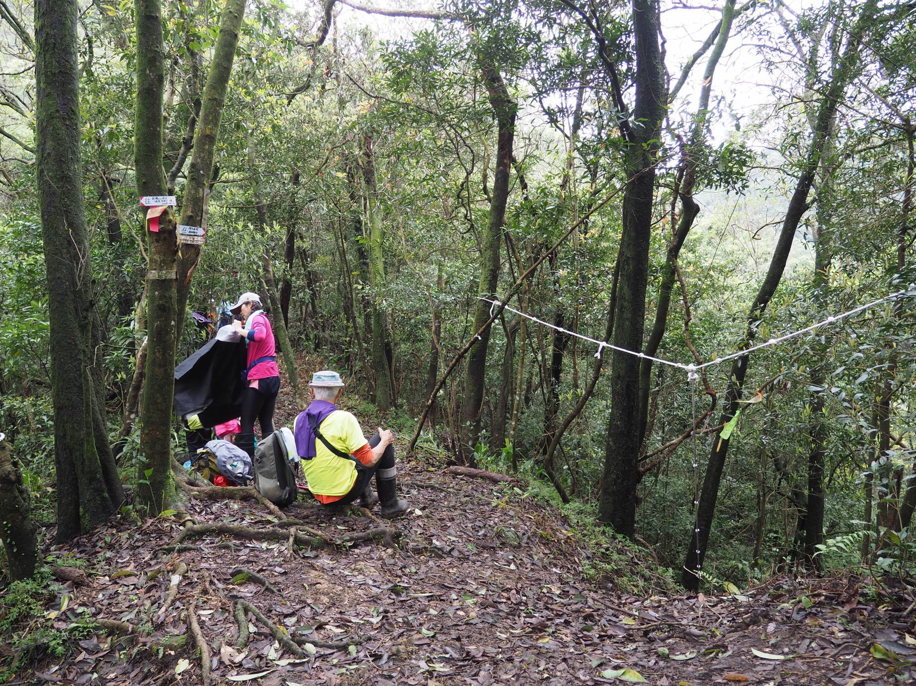 姜子寮古道は、縦走路に比べると歩行頻度が少ないので、道の状態は落ちるが道筋ははっきりし、迷う恐れはない。勾配は結構急で、ロープセクションも多い。14時32分、幅広の未舗装道路に出る。ちょうど一台の車がやってきて停める。対面には門があり、車を降りた女性はここは私有地だから入るな、とのこと。地図上には、この場所から直接姜子寮絕壁への道があるので、登山者が入ったことがあるのだろう。