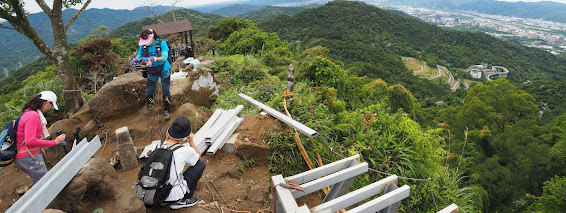On our way further up we pass two more platforms with a hut built by local people and an electric transmission tower to reach the summit at 9:20. The rather small summit of Qingshui dajian-shan is encircled with trees except a north corner, which arrows a vista over the Taipei basin. At the altitude of 274m, it reveals wider view than the observation deck of a while ago.